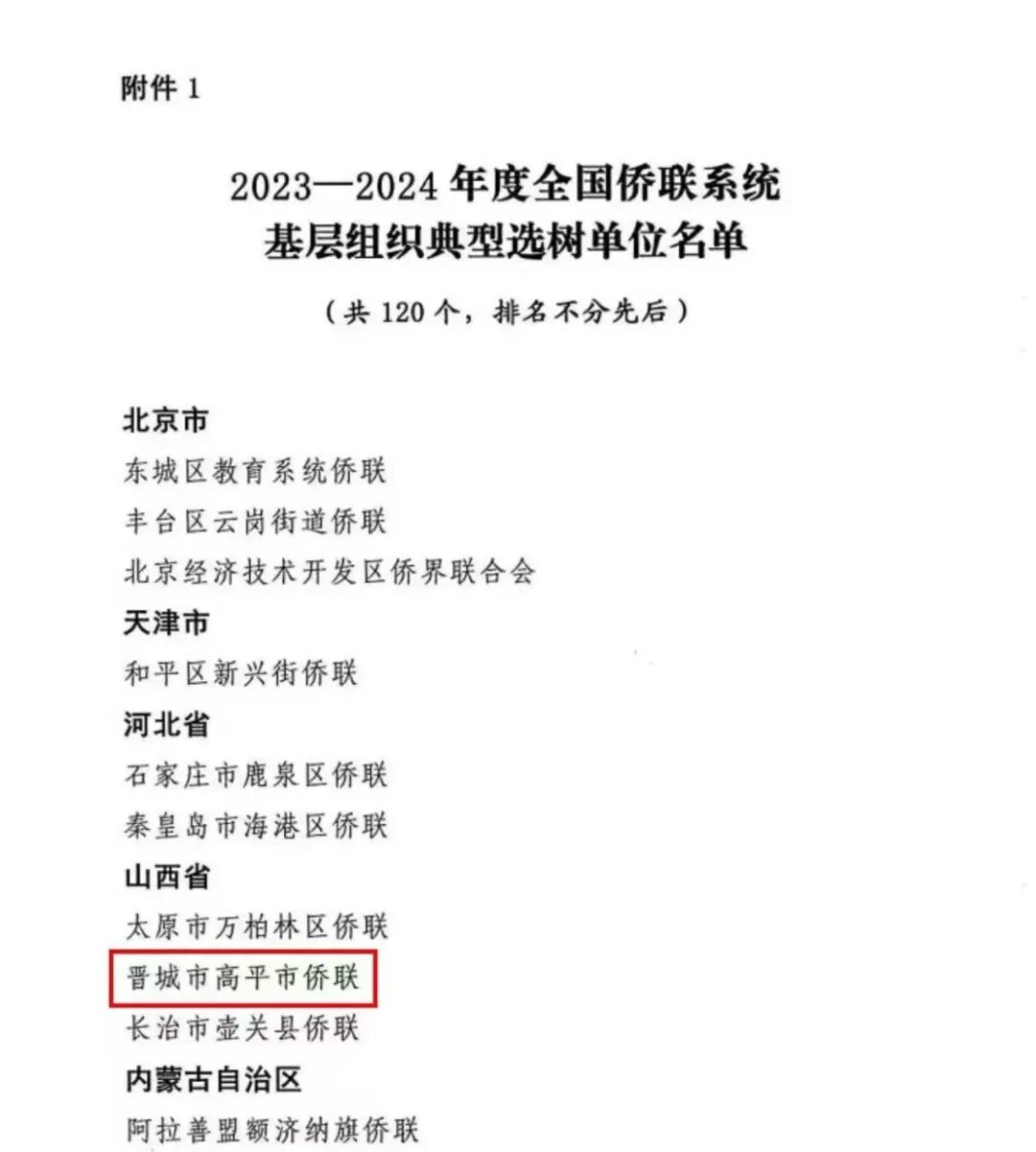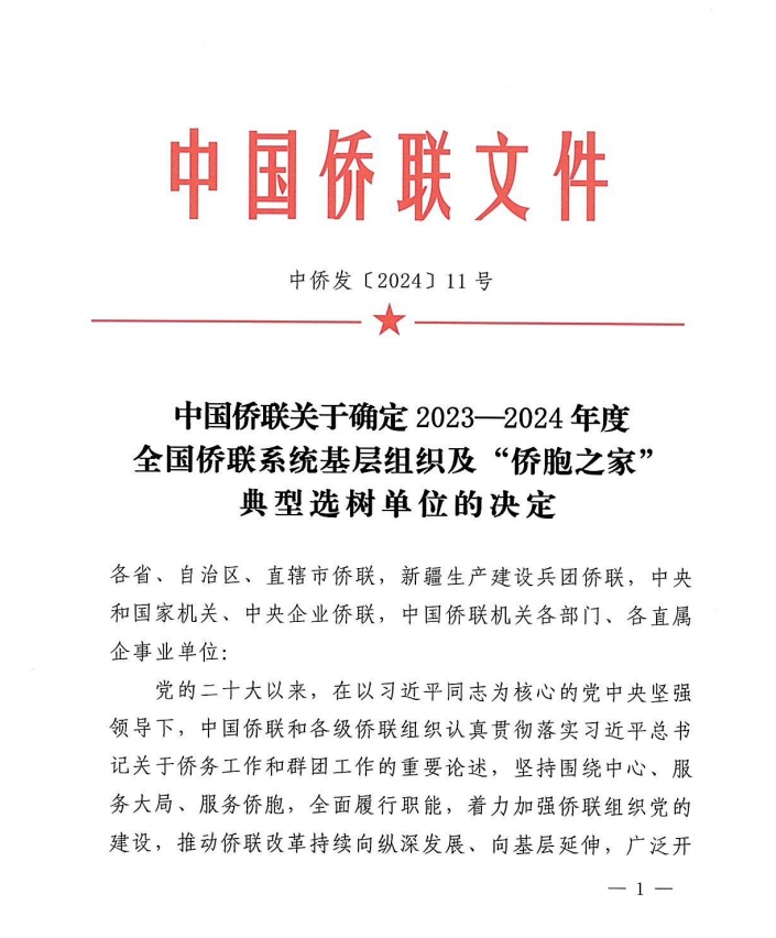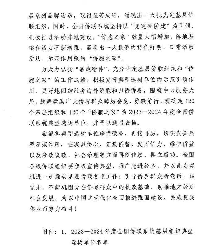 为大力弘扬“嘉庚精神”,充分肯定基层侨联组织和“侨胞之家”的工作成绩,积极发挥典型选树单位的示范引领作用,中国侨联公布了2023—2024年度全国侨联系统典型选树单位名单,并予以通报表扬。根据《中国侨联关于确定2023-2024年全国侨联系统基层组织及“侨胞之家”典型选树活动的决定》(中侨发〔2024〕11号),高平市侨联荣获全国侨联系统基层组织典型选树单位。
