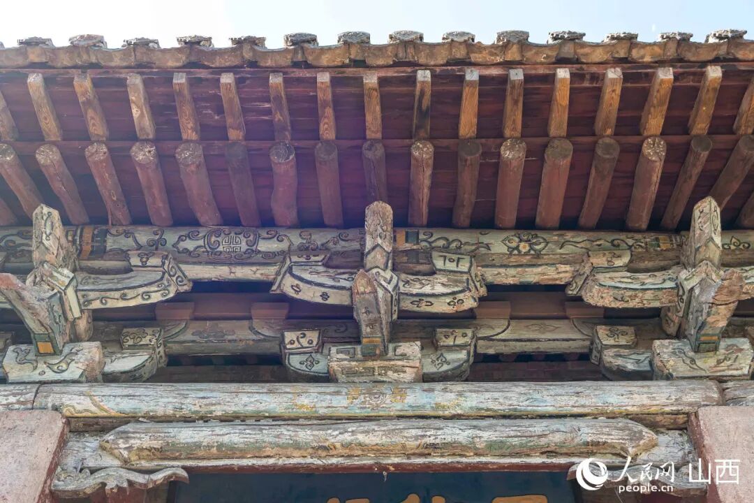 作为宫观核心建筑,正殿面阔三间、进深六椽,单檐歇山顶,其梁架结构堪称金元时期木构建筑的典范。采用四椽栿对前乳栿通檐用三柱的构架,脊部以叉手、合踏、蜀柱与丁华抹颏拱组合承重,山面排架通过爬梁架于四椽栿上,这种技术有效分散屋顶荷载,至今仍保持结构稳定。