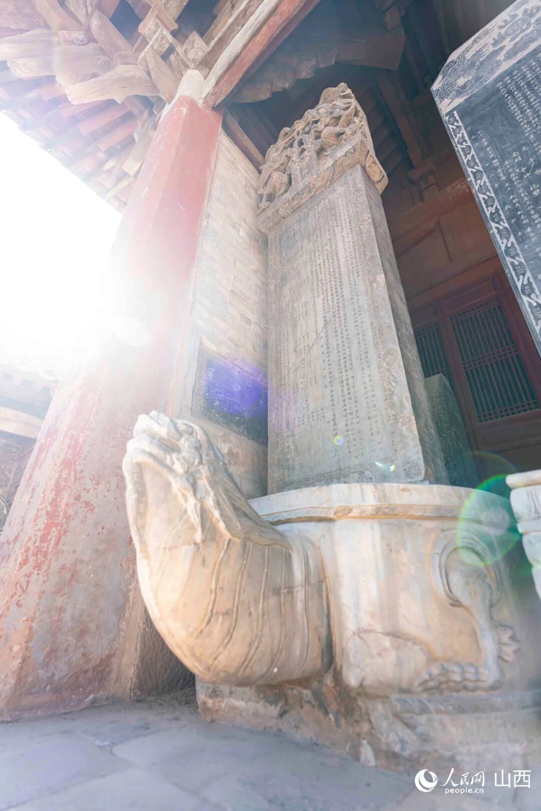 过月台仰望正殿,前檐方形抹角石柱侧脚明显,据明万历二十九年《重修二仙宫碑记》记载:“创自唐昭宗天佑之末年也,其来远矣”,结合在正殿须弥座神台发现的金大定十二年题记石碑,可确认其主体建筑为金代遗构。