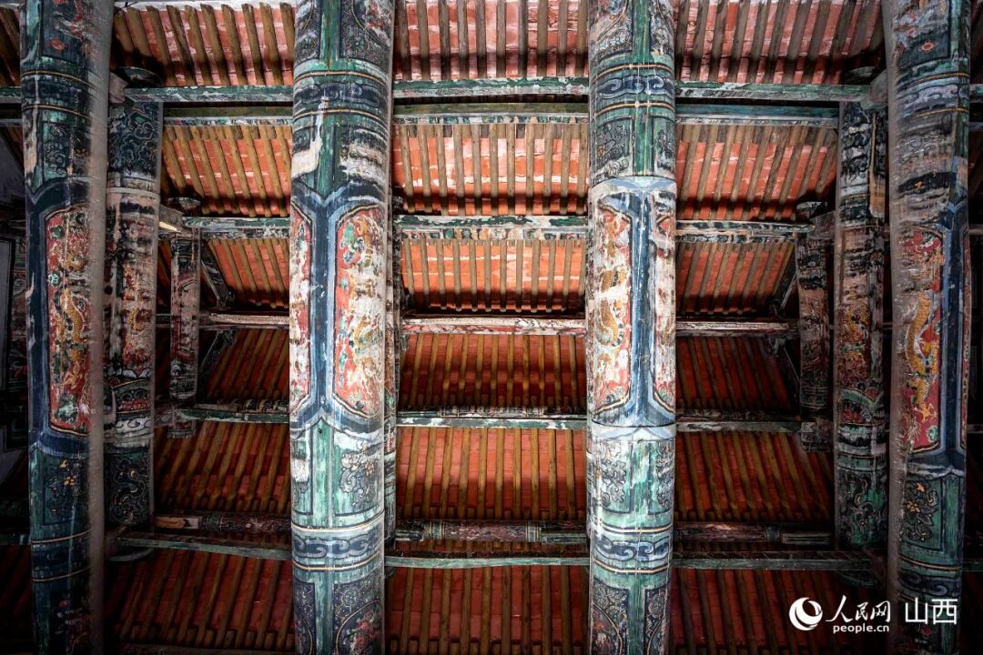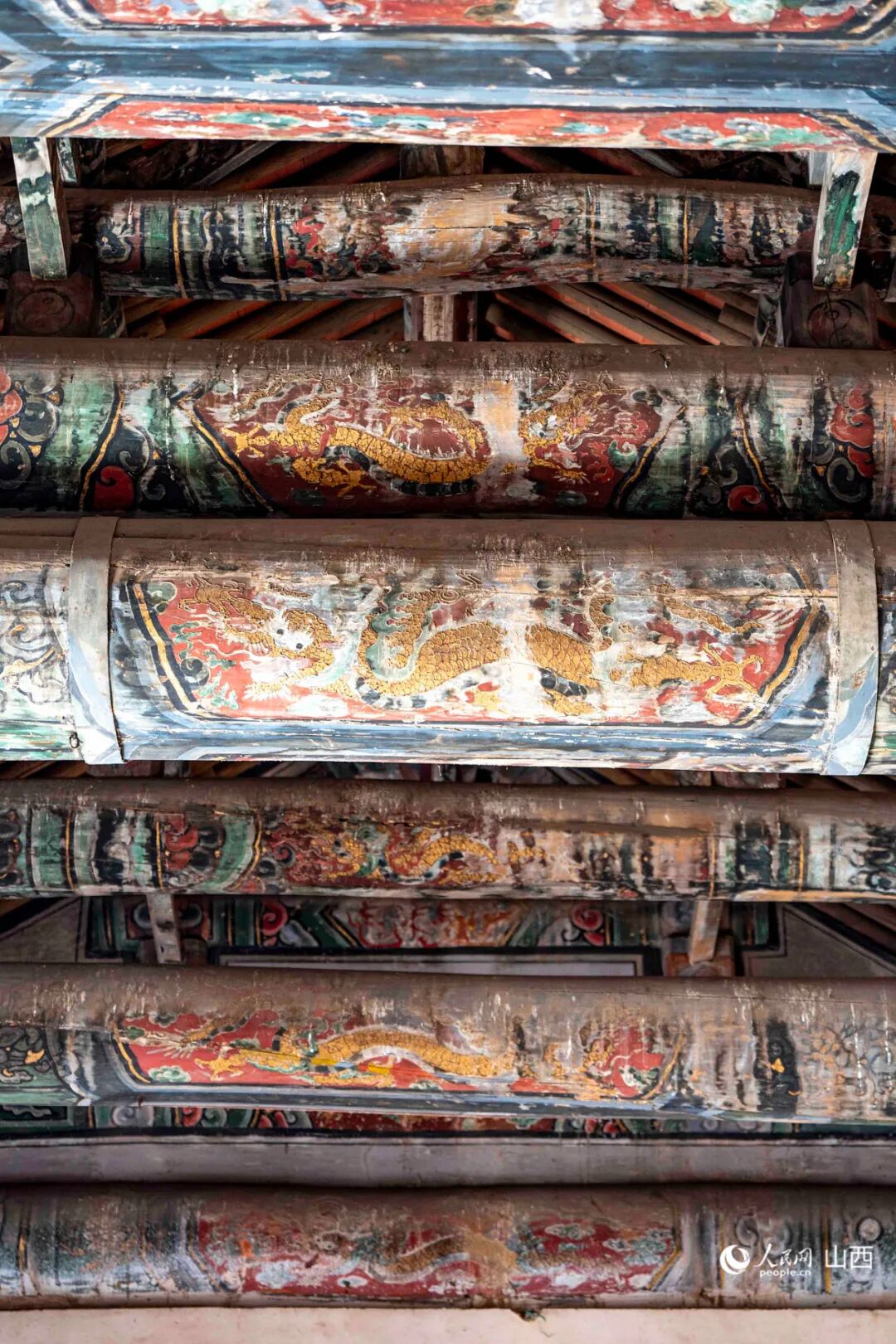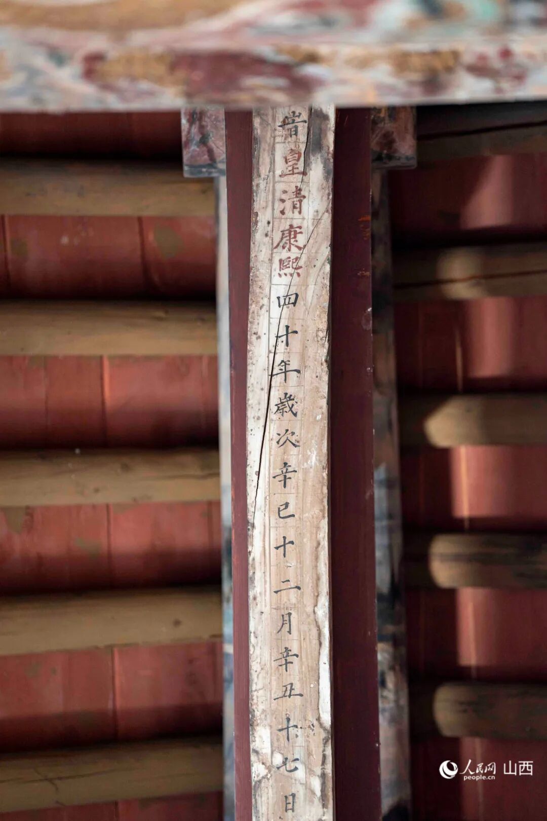 主殿整体造型繁复,为典型的清代风格。檐下设高大的方形抹角石柱,柱础四面浮雕神兽,四角雕成兽头形象,工艺精湛且寓意镇宅护佑。殿内顶部为彻上明造,脊枋题记清晰可见“时皇清康熙四十年岁次辛巳十二月辛丑十七日己巳庠生杨”等字,在椽袱处绘有大量彩画。
