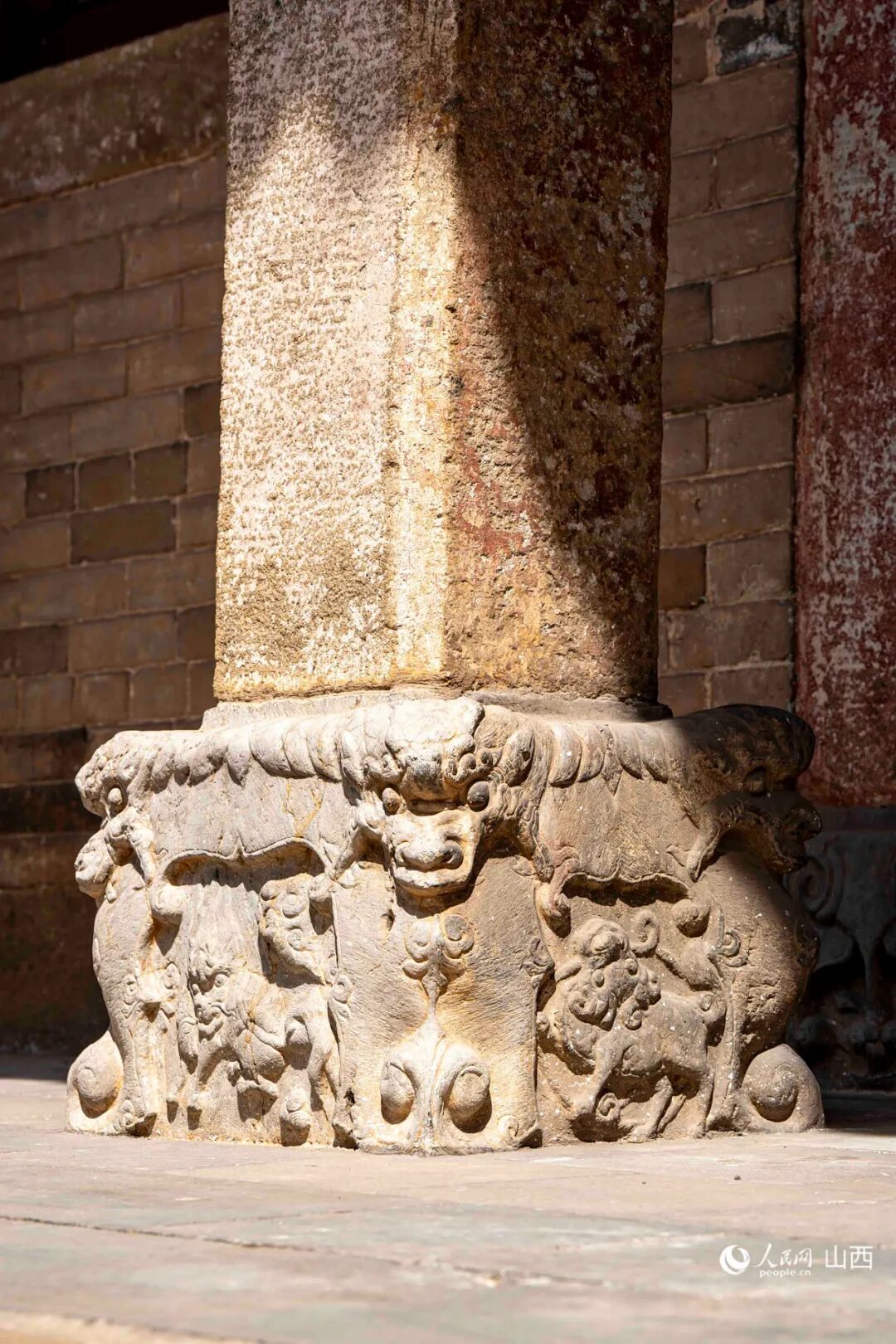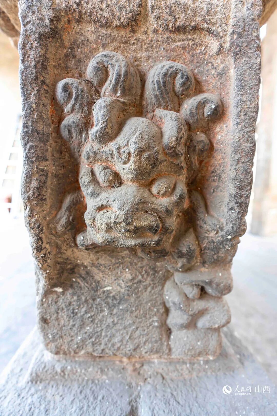 戏台台基高1.1米,上下均用条石包砌,呈简单须弥座样式。正面台基束腰石刻有莲花、牡丹与化生童子的图案,两侧是石雕力士,中间被岁月磨圆的狮首石雕仍保持着凝望戏台的姿态,仿佛仍在聆听八百多年前的鼓乐之声。