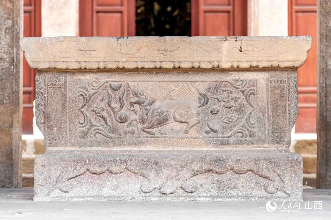 献殿位于二郎庙中轴线核心区域,介于戏台与正殿之间。其平面布局与正殿台基相连,但低三级踏步,构建出递进式空间序列。面阔三间,进深四椽,为明代遗构。殿内中央安置明万历九年石雕供桌,桌面为砂石材质,而桌体和底座为少见的青石材质。前后束腰处雕刻缠枝牡丹、麒麟望月等吉祥纹样,线条流畅且立体感强烈,兼具实用与仪式功能。