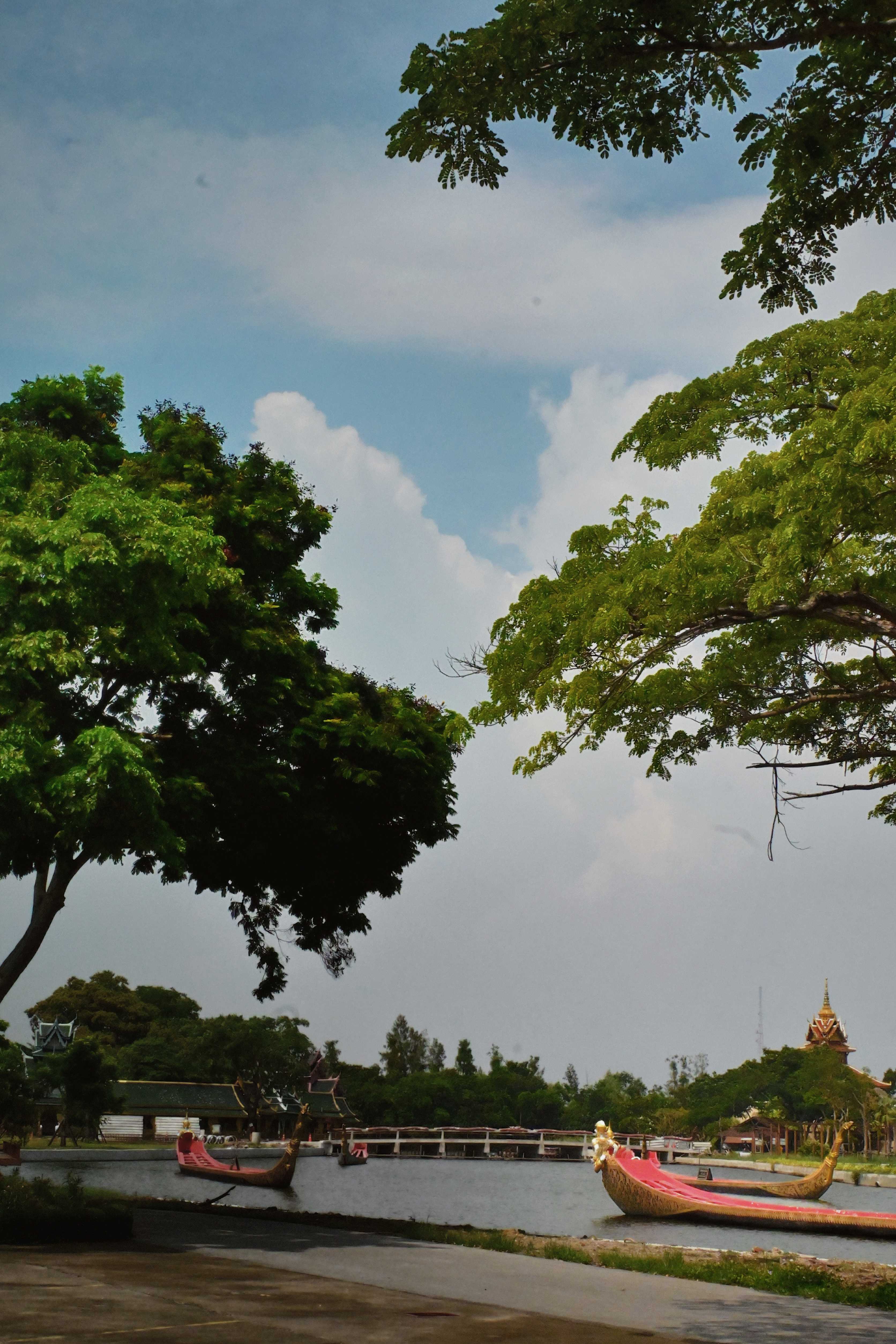 作品简介:金色龙舟静静停泊在碧波中,周围点缀着塔楼与树影。画面凝固了节庆的热烈气氛,也定格了南洋的风情绿意。