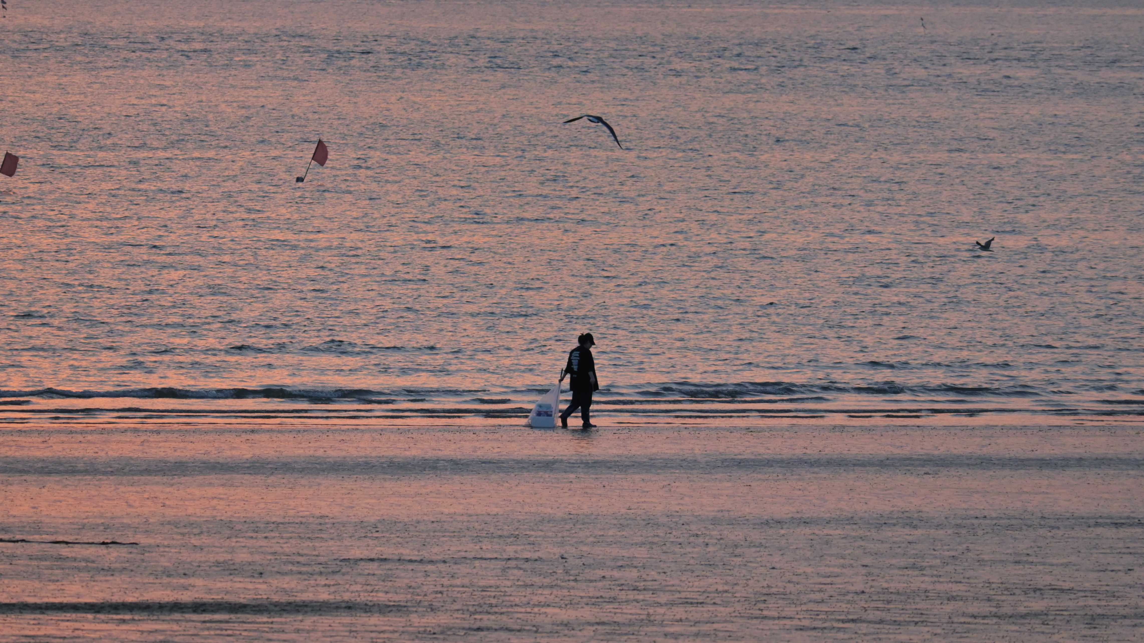作品简介:晚霞如潮水般倾泻,将海面染成温柔的粉橙色。滩涂上缓缓走过的人影与飞过的海鸥,与暮色一同沉静。平凡的瞬间因光影而生出诗意,仿佛日常也被赋予了浪漫的余韵。